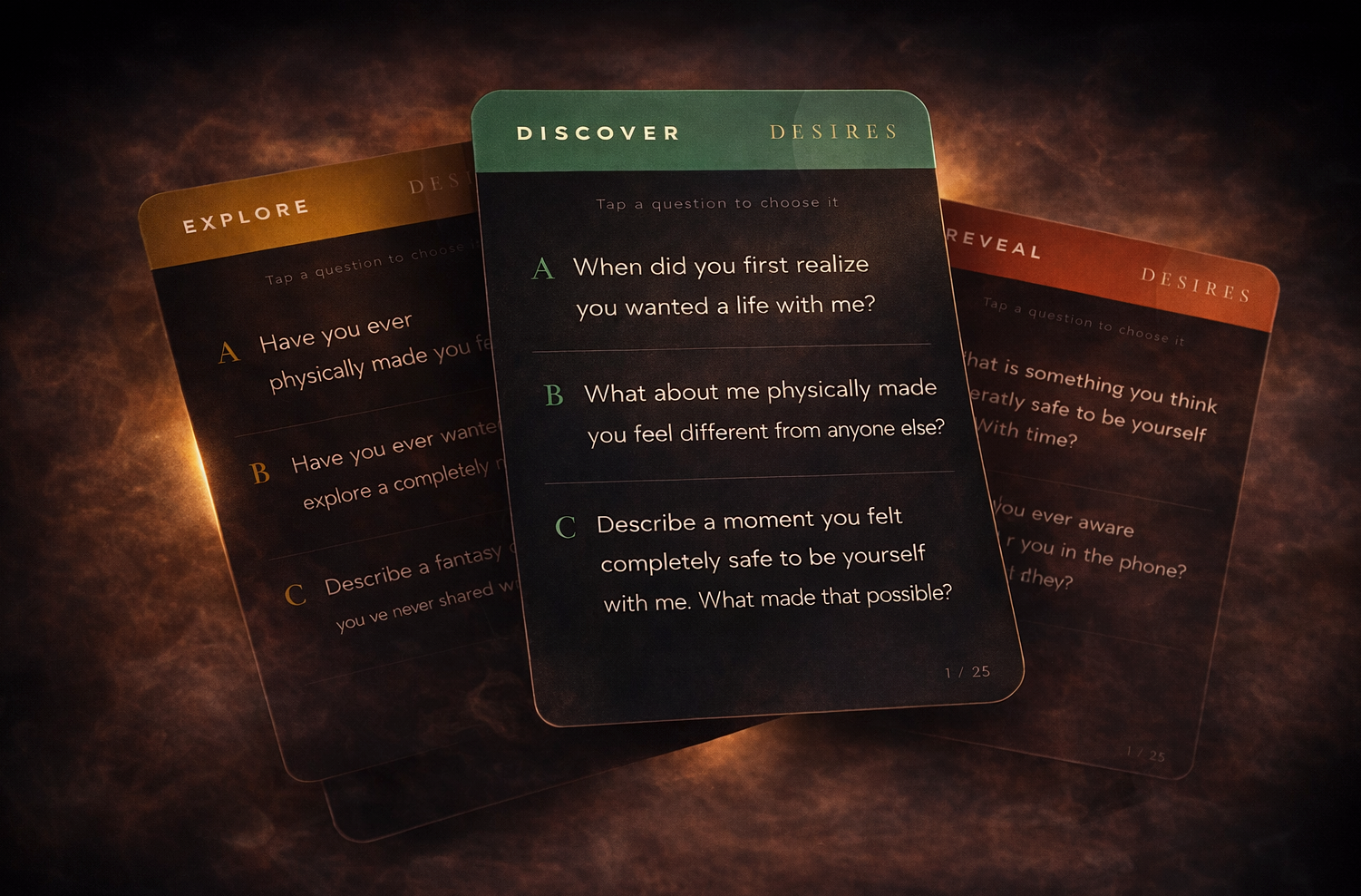 100 cards. 300 questions. Four progressive tiers that take you from comfortable to completely open.